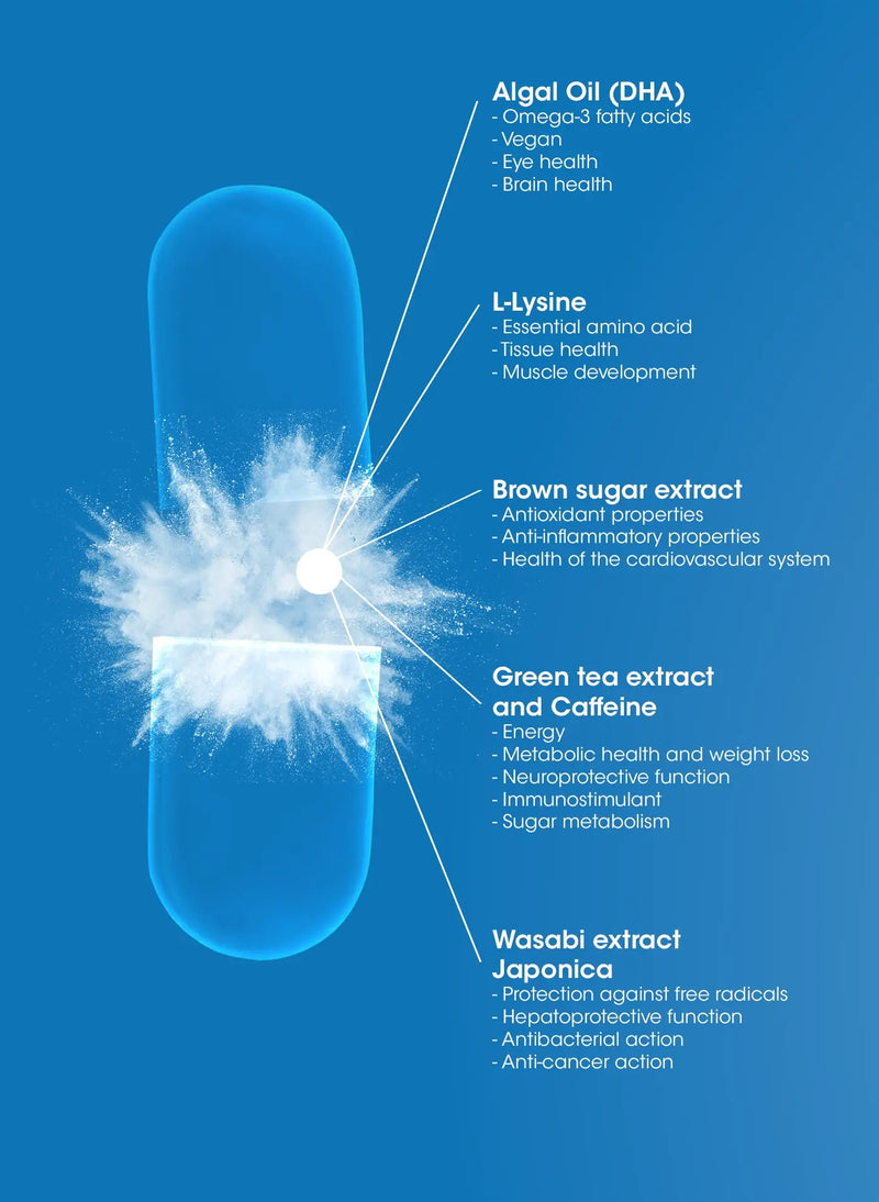 Dual-cap design separates and times ingredient release; DHA is absorbed from the outer capsule, while the inner capsule gradually releases the remaining nutrients.